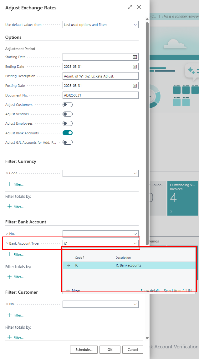 In Bank Accounts add Bank Account Type if you want to filter certain Bank Account when you run Adjust Exchange Rates. Also add Bank Acc. Posting Group if missing.